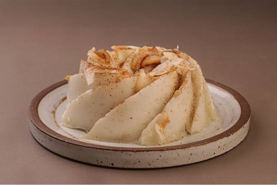 - Desenforme com cuidado e decore-o polvilhando flocos de coco torrado e canela em pó